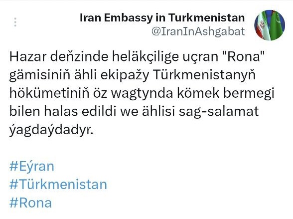 اطلاعیه سفارت جمهوری اسلامی ایران در ترکمنستان درباره کشتی رونا