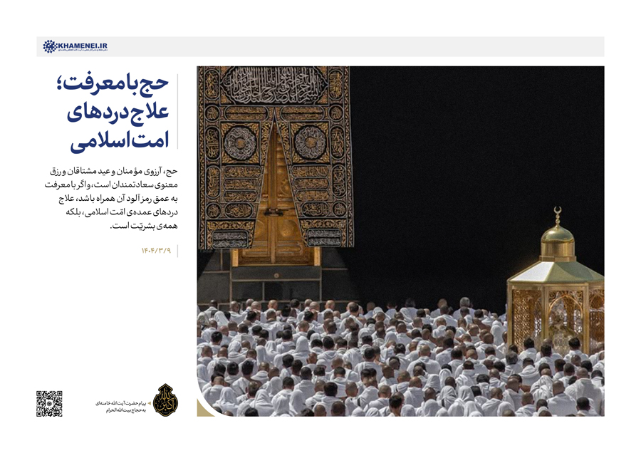 حضرت آیتالله خامنهای رهبر انقلاب اسلامی در پیامیبه مناسبت موسم حج امسال، حجِ همراه با معرفت و درسهای آن را علاج دردهای امروز دنیای اسلام برشمردند و با اشاره به جنایات و شقاوتهای رژیم صهیونی در غزّه، مهمترین وظیفه دولتهای اسلامی را مانع شدن از ادامه فاجعه بشری در غزه و فشار به آمریکا بهعنوان حامی اصلی رژیم صهیونی برای توقف کمکها و حمایتها دانستند و از ملتها خواستند مطالبهگرِ عمل دولتها به این وظیفه باشند.