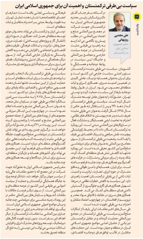یادداشت آقای علی مجتبی روزبهانی سفیر جمهوری اسلامی ایران در ترکمنستان در آستنانه سفر آقای پزشکیان به این کشور برای حضور و سخنرانی در مجمع بین المللی صلح و اعتماد با عنوان سیاست بی‌طرفی ترکمنستان و اهمیت آن برای جمهوری اسلامی ایران در روزنامه ایران منتشر شد.