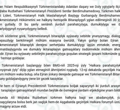 Türkmenistanyň Bitaraplygynyň otuz ýyllyk baýramy mynasybetli Eýran Yslam Respublikasynyň Türkmenistandaky ilçisiniň gutlag ýüzlenmesi neşir edildi