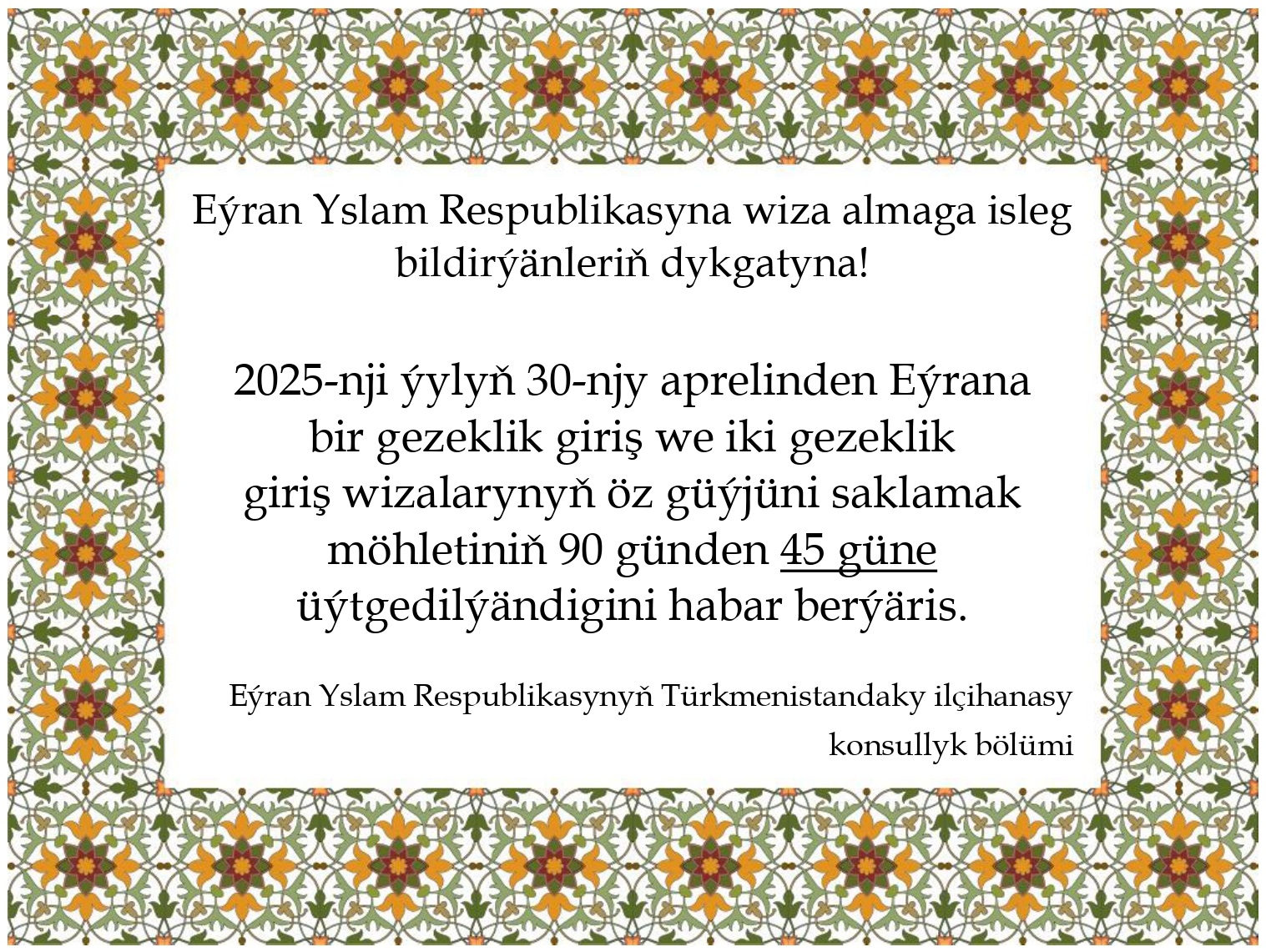 2025-nji ýylyň 30-njy aprelinden Eýrana bir gezeklik giriş we iki gezeklik giriş wizalarynyň öz güýjüni saklamak möhletiniň 90 günden 45 güne üýtgedilýändigini habar berýäris.