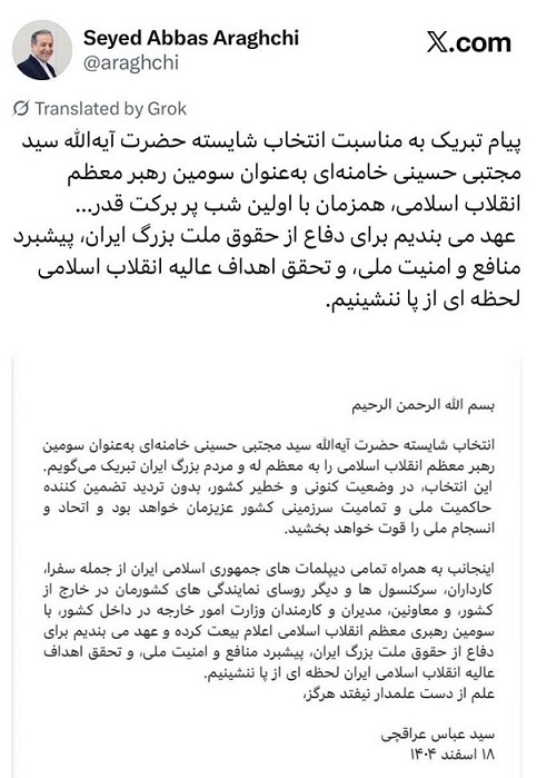Eýran Yslam Respublikasynyň Daşary işler ministriniň, hormatly Aýatolla Seýed Mojtaba Hoseýni Hameneýiniň Eýran Yslam Rewolýusiýasynyň beýik lideri hökmünde saýlanmagy mynasybetli gutlag haty.